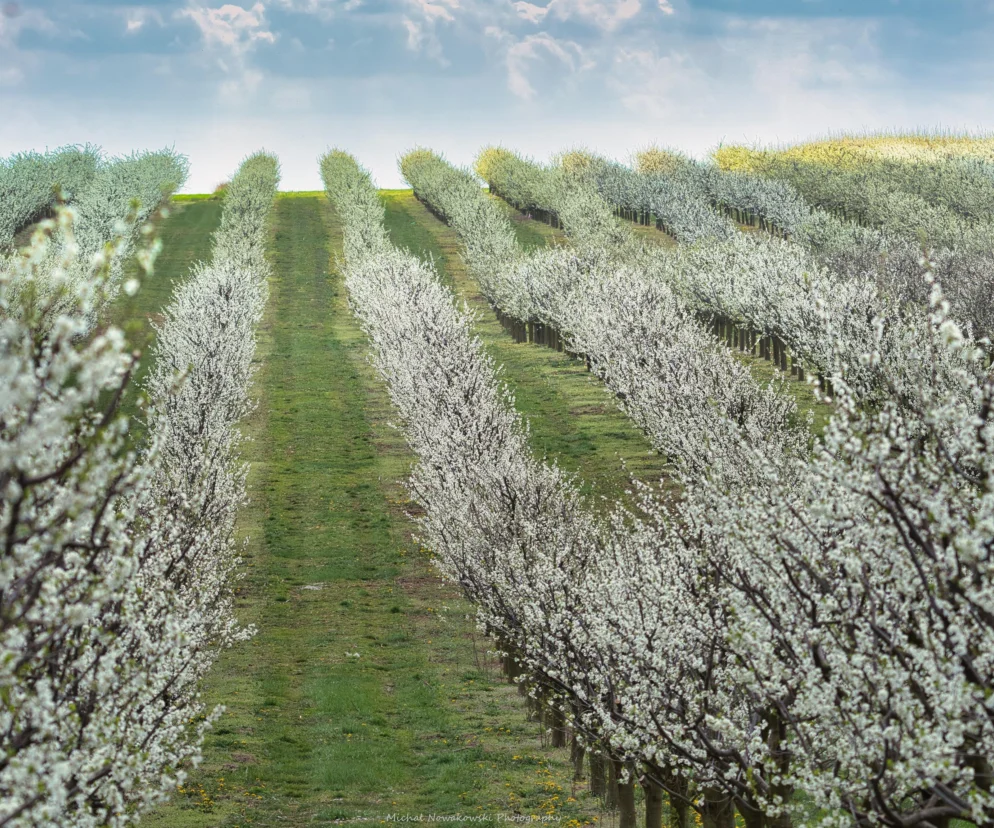 Spacerując miedzami, czujesz pod stopami miękką trawę, a nad głową masz baldachim z płatków, które przy silniejszym wietrze opadają niczym wiosenny śnieg. W Szydłowie uprawia się aż 45 różnych odmian śliwek – od wczesnych, takich jak Herman czy Ruth Gerstetter, po późne, mięsiste Presidenty czy tradycyjne Węgierki. Każda z nich kwitnie nieco inaczej, tworząc subtelną mozaikę bieli i jasnego różu. Poranne światło, przebijające się przez te kwiatowe chmury, nadaje okolicy nierealny, niemal bajkowy klimat.